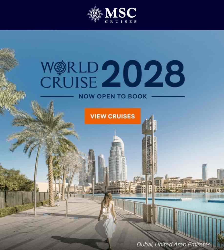 Az MSC kampány üzenete szerint az utasok „életre szóló utazásra” indulhatnak, ahol minden megálló egyedi, egyszeri élményt kínál. A program olyan ikonikus élményeket emel ki, mint az európai történelmi városnézés, a Csendes‑óceáni szigetvilág szigetről szigetre bejárható útvonala és a Közel‑Kelet modern nagyvárosai.