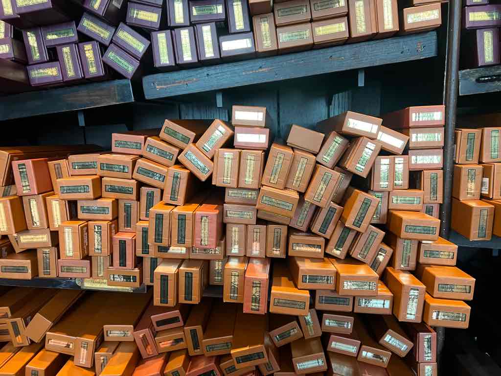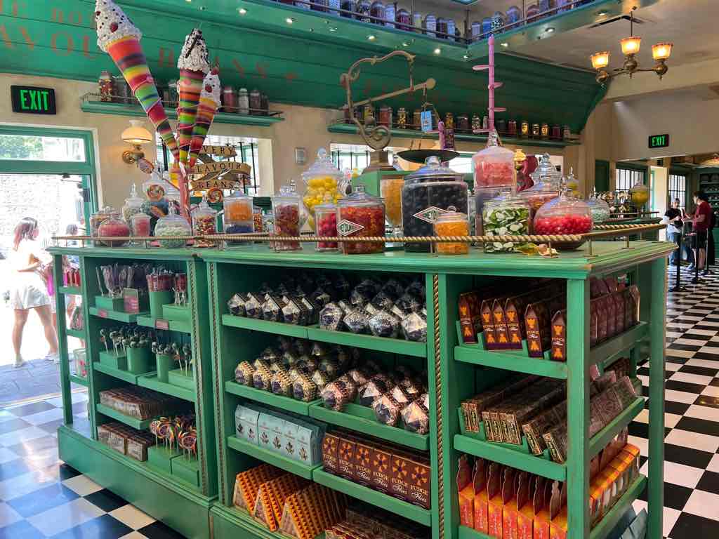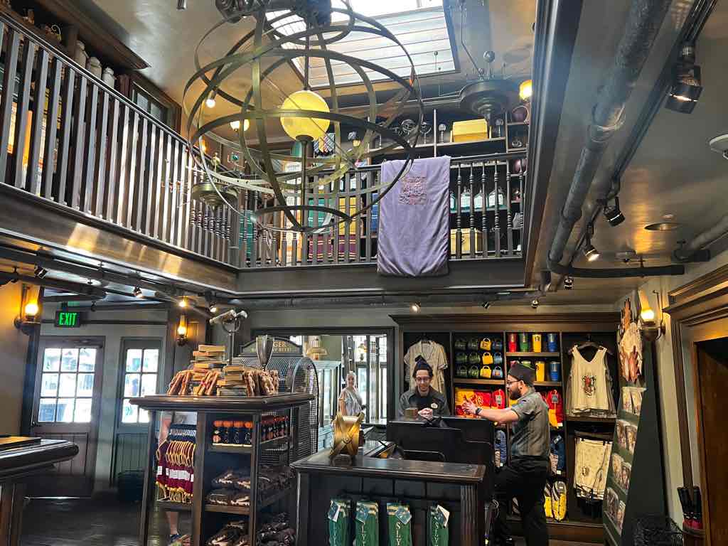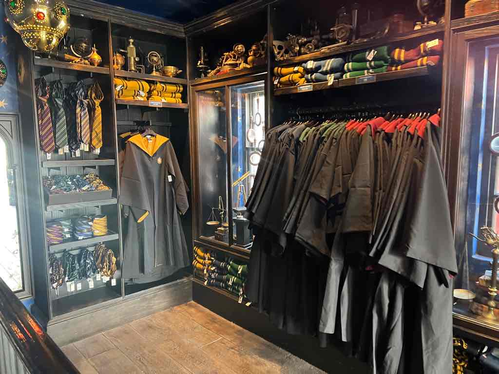 A falu utcáján sétálva a vendégek olyan ikonikus üzletekbe térhetnek be, mint a Honeydukes édességbolt, a Dervish and Banges vagy Filch’s Emporium of Confiscated Goods. A Honeydukes polcain csokibékák, mindenízű drazsék és más filmhű édességek sorakoznak, míg Filch boltjában relikviák, ház-színű sálak, pólók és filmes kellékekre emlékeztető ajándéktárgyak várnak a rajongókra.