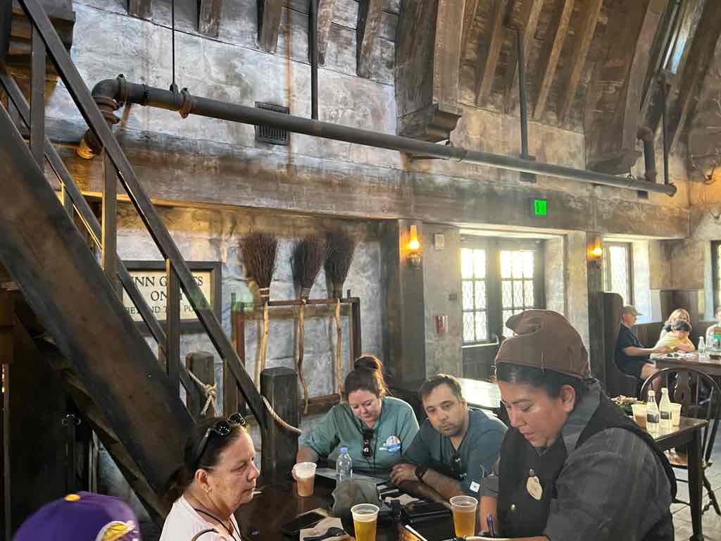 A Hogsmeade élmény fontos része az étkezés: a Three Broomsticks étterem klasszikus brit fogásokat kínál, köztük halat és sült krumplit, pásztorpite-féle ételeket és nagy, megosztható „lakomákat”. A szomszédos Hog’s Head pubban a vendégek különböző Butterbeer-variációkat, üdítőket és alkoholtartalmú italokat kóstolhatnak, miközben a bárpult mögött időnként megmozdul a névadó disznófej animatronikusa.